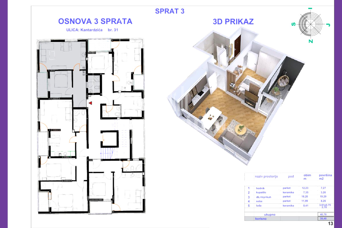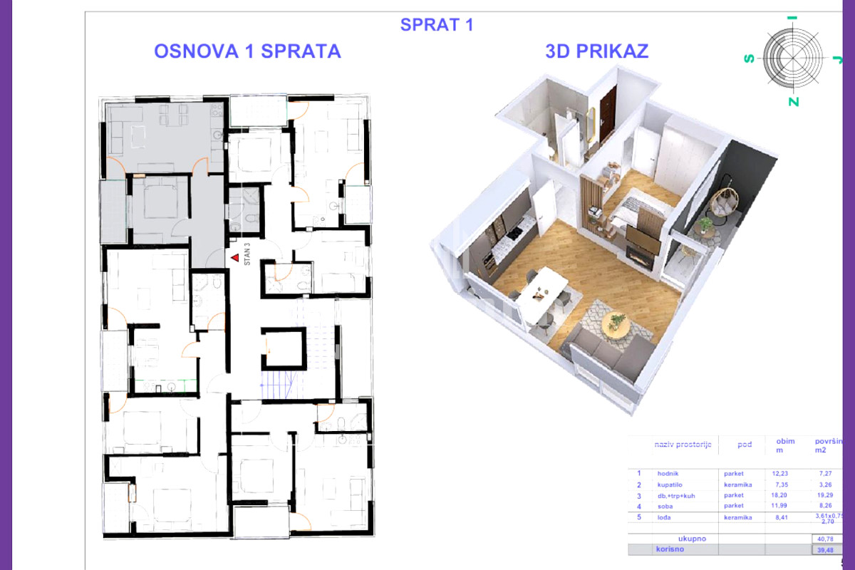 ✔ III sprat – 39,50m² (jednoiposoban) – 118.500 KM,