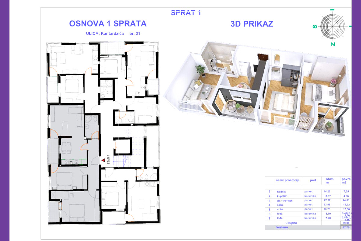 ✔ I sprat – 67,70m² (dvoiposoban) – 203.100 KM,