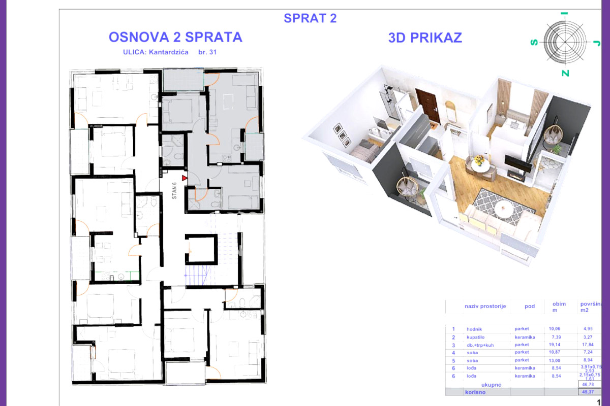 ✔ II sprat – 45,50m² (dvoiposoban) – 136.500 KM,